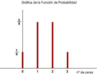 De los ocho posibles resultados, en sólo uno de ellos no se obtiene ninguna cara, por tanto se tiene P[ X = 0 ]= 1/8. Razonando análogamente, en tres casos hay una cara P[ X = 1 ]= 3/8, en tres casos hay dos caras P[ X = 2 ]= 3/8 y en uno sólo hay tres caras P[ X = 3 ]= 1/8.